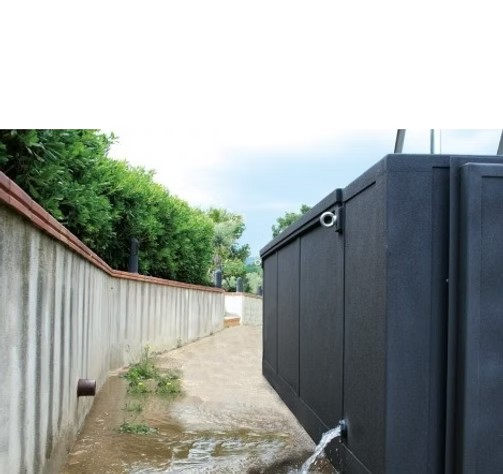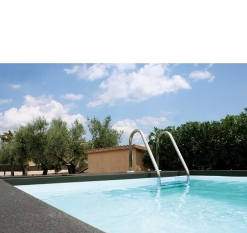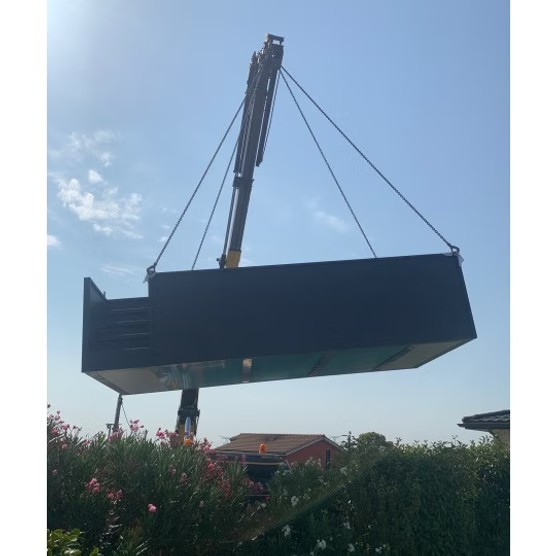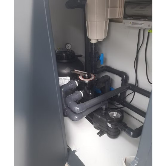 Transportabler Schwimmbadcontainer OHNE GENEHMIGUNG 5M25x2M55x1M26, Innenmaße 4M15 x 2M25 (Oberflurversion). Gewicht des leeren Beckens: 1150 kg. Becken ohne Installation, ausgestattet mit einem Filtersystem (1 Skimmer, 2 Rücklauf- und Ablassdüsen, 1 weißer LED-Projektor mit Fernbedienung, 1 Sandfilter Ø 400 mm – 6,5 m³/h mit einer Filterfeinheit von 40 bis 50 Mikrometern mit 6-Wege-Ventil (Sand wird mitgeliefert), 0,5 PS-Motorpumpe, 1 Schaltkasten). Alle Maschinen werden im Technikraum untergebracht. Was die Auskleidung betrifft, so wird sie vermarktet (hellgrau 75/100) und besteht aus einer Hochleistungsmembran, einer lackierten Oberfläche auf der Wasserseite, Beständigkeit und Schutz gegen Alterung durch ultraviolette Strahlen, gegen Abrieb und Kratzer, gegen Fleckenbildung, gegen Mikroorganismen, gegen Angriffe und Schmutz auf der Wasserseite.