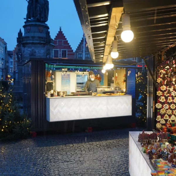 Die Containerbar ist mit einem Faltdach und Doppeltüren ausgestattet – sowohl an der Längs- als auch an der Schmalseite. Die Abmessungen ähneln denen eines 16-Fuß-Absetzcontainers, sind jedoch in Breite und Länge jeweils einen halben Meter größer.
