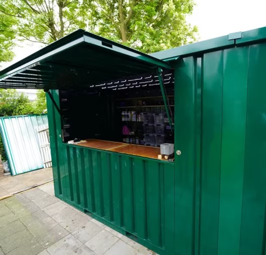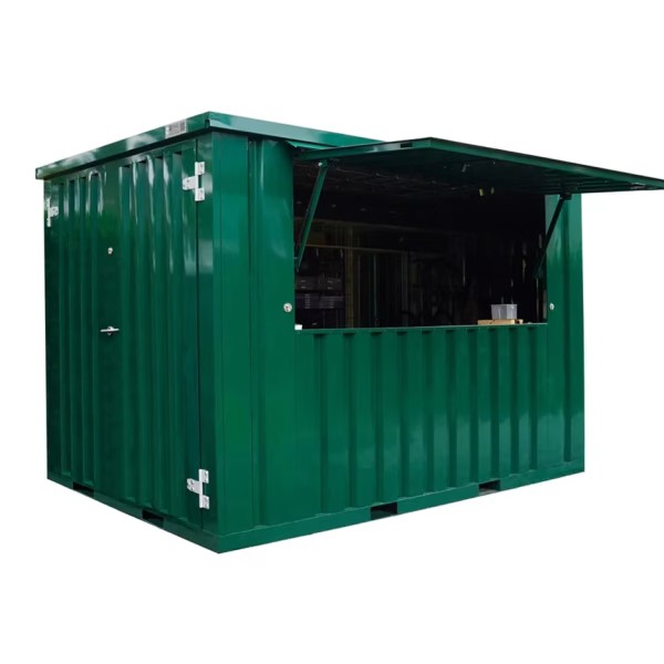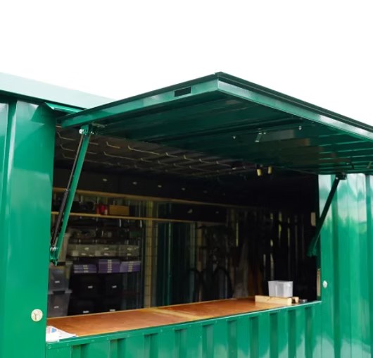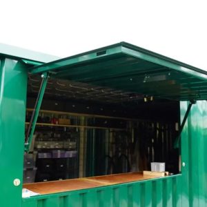 Der grüne, faltbare Barcontainer misst ca. 3 x 2 Meter und verfügt über ein faltbares Vordach. Die Abmessungen entsprechen in etwa denen eines 10-Fuß-Faltcontainers. Dies ist ideal für Personen, die auf das Trockene warten, und verleiht dem Container den Look einer echten Bar. Das Vordach ist zudem abschließbar, sodass der Barcontainer mit den darin befindlichen Gegenständen sicher abgestellt werden kann. Zusätzlich befindet sich an der Schmalseite eine Doppeltür, durch die große Gegenstände wie ein Bierfass hineingebracht werden können. Damit ist er die perfekte Lösung für den Barbetrieb bei Veranstaltungen. Ein schlichter, aber solider Barcontainer in einer stilvollen und schlichten Farbe wie Grün, RAL 6016.