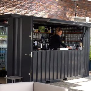 Die Containerbar ist mit einem Faltdach und Doppeltüren ausgestattet – sowohl an der Längs- als auch an der Schmalseite. Die Abmessungen ähneln denen eines 16-Fuß-Absetzcontainers, sind jedoch in Breite und Länge jeweils einen halben Meter größer.